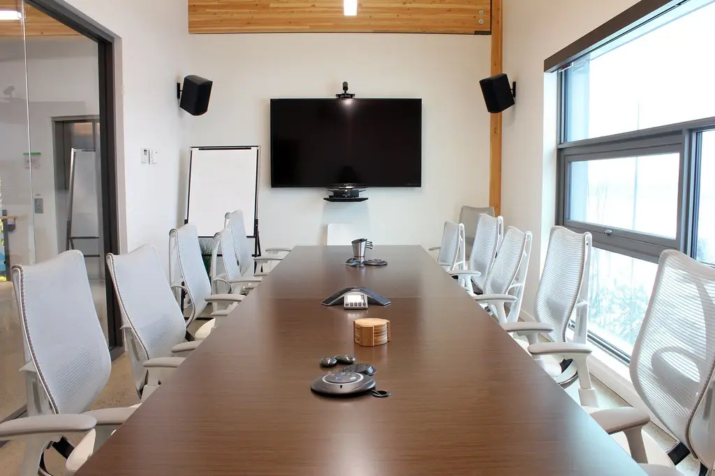 In addition to huddle rooms, we integrated a Windows-based Zoom Room integration in the main boardroom. This includes automatic PTZ cameras and whole-room microphones for a premium experience.
